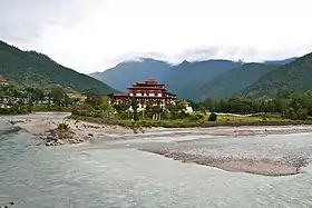 Панорамний вид на дзонг Пунакха, розташований в місці злиття річок Мо і Пхо