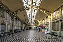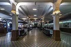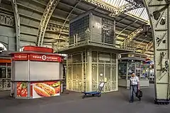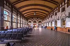Основне приміщення вокзалу — це гігантський вестибюль з парадними сходами. Висота залу становить понад 20 метрів, зал вінчає металевий купол. Парадні сходи залу є домінантою приміщення, вона прикрашена мармуровими поручнями з декоративними бронзовими вставками. Освітлення залу виконано з використанням природного освітлення — денне світло проходить в залу через розташовані по всіх стінах вітражні вікна. Штучне світло створюється за допомогою електричних світильників, розташованих по периметру залу. Вони виконані із заліза і пофарбовані в чорний колір.