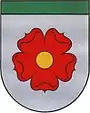 У срібному щиті під вузькою зеленю смугою п'ятилистяна, червона, iз золотою серединою троянда.