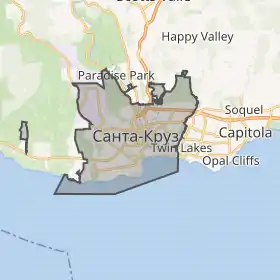 ![]() ![]() ![]() ![]() ![]() ![]() Clockwise: Downtown Santa Cruz; Mission Santa Cruz; U.S. Post Office; Santa Cruz Beach Boardwalk; Seaside Beach; Mission Plaza.