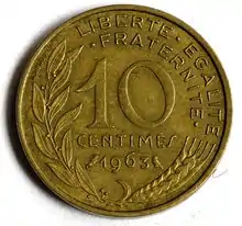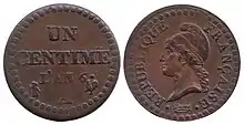 - Розмінна монета Франції. У 1795 році грошовою одиницею Франції став франк, що ділився на 100 сантимів. Монети карбувалися з міді або бронзи номіналом 10, 5, 2 і 1 сантим і з срібла (а також з нікелю) 50, 25 і 20 сантимів. Під час Другої світової війни франк сильно знецінився, внаслідок чого сантим зник з обігу, але використовувався як лічильна одиниця. Карбування сантима відновлено в 1960 році.
