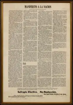 У 1910 році, в своїй передвиборчій компанії на пост президента та маючи великі шанси на перемогу, Франціско І. Мадеро здійснив три подорожі по різних містах з метою поширення інформації про свою Антирелекаційну партію, яка виступала проти переобрання Діаса на наступний термін. У Сан-Луїс-Потосі Мадеро був затриманий та окружним суддею звинувачений у підбурюванні народних мас до повстання. Мадеро разом з його прибічниками ув'язнили до в'язниці штату, але через 45 днів звільнили під заставу без права виїзду за територію штату. За той час відбулося переобрання президента Портфіріо Діаса. Мадеро втік до міста Сан-Антоніо (штат Техас, США) де почав зі своїми послідовниками працювати над Маніфестом нації («план Сан-Луїсу»), в якому він оголошував вибори президента та народних депутатів у квітні та червні недійсними та закликав 20 листопада піднятися народ на збройне повстання[2]. 5 жовтня 1910 року в Сан-Луїс-Потосі Мадеро підписав «план Сан-Луїсу», а вже невдовзі копії були роздруковані в Мехіко та розповсюджені серед людей[3]. 18 листопада в Пуебло на чолі з Аквіласом Серданом викрили групу людей, які підготовлювали план усунення Діаса та були розстріляні поліцією[4]. 20 листопада 1910 року почалася мексиканська революція[3].