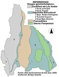 Рельєф переважно гористий. На заході провінції знаходять Анди, зокрема хребти Головна Кордильєра і Прекордильєра. Найвищою точкою є гора Мерседаріо (6770 м), найнижчою — болота Гванакаче (600 м). На сході розташовані посушливі рівнини, над якими знаходяться Пампінські гори. Загалом провінція знаходиться у сейсмонебезпечній зоні.