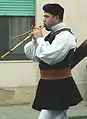 Чоловік в національному костюмі, який грає на музичному інструменті "Launeddas"