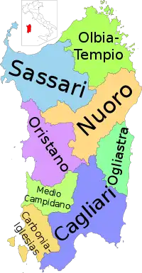 | Провінції | Кальярі, Карбонія-Іглезіас, Медіо-Кампідано, Нуоро, Ольястра, Ольбія-Темпіо, Орістано, Сассарі | ||||