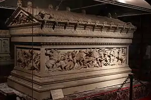 На одній стороні саркофага зображена битва при Іссі (ймовірно, за тим же джерелом, що й мозаїка Олександра), на другий — мисливські сцени, можливо, за участю Александра й царя Сідону.