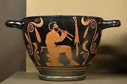 ![]() Червонофігурний скіфос: Сатир грає на авлосі |
