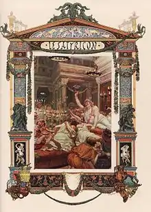 До столу подають засмаженого вепра в шапці раба-вільновідпущеника, що Енкольпій просить свого сусіда пояснити та довідується про своєрідний гумор Трімальхіона. Бенкет продовжується виступом акробатів. Прибуває улесливий каменяр Габіннас зі своєю дружиною Сцинтіллою, яка порівнює прикраси із вродою Фортунати. Трімальхіон оголошує свій заповіт і свариться з Фортунатою. Він розбазікує як нажив свої перші статки принизливою службою — він був коханцем свого патрона і його дружини. Але всі свої ганебні вчинки та махінації Трімальхіон виправдовує тим, що богиня Фортуна прихильна до нього за його наполегливість. Наостанок Трімальхіон розігрує як повинен відбуватися його похорон.