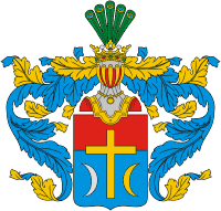 У щиті, розділеному горизонтально на два поля червоне і блакитне, зображений золотий хрест, по боках якого в блакитному полі означені два місяця, з правого боку срібний, а з лівої — золотий, рогами зверненими до боків щита.