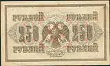 Керенки: 250 рублів, реверс. В центрі зображена свастика, під цифрами нескінченний вузол.