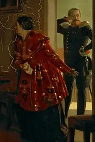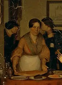 Праворуч, за відчиненими дверима, стоїть майор, який підкручує вуса в передчутті скорого багатства. Його привела сваха, щоб просити руки купецької дочки. Судячи з характеру сцени, переговори з батьками нареченої були проведені свахою заздалегідь, і глядачі спостерігають перший візит майбутнього нареченого в купецький будинок. Купецька родина чекала на гостя, проте в кімнаті ще тривають останні приготування. Центральна постать — це купецька дочка, поруч стоїть її мати, а позаду, в кутку, — бородатий батько, котрий незграбно застібає сюртук. Дочку, вдавано збентежену появою нареченого, мати утримує за сукню. Ця розкішна сукня, намисто й зачіска свідчать, що дочка щойно закінчила чепуритися. В лівій частині кімнати зображений стіл з закусками, біля якого знаходяться три другорядні персонажки — кухарка, яка ставить на стіл пісні страви (кулеб'яку, оселедець і пляшку вина), та приживалка (бідна жінка, що живе в будинку за рахунок господарів) — мабуть глуховата, котра не розуміє причину переполоху[11].
