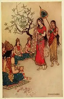 Сваямвара (санскр. स्वयंवर — звичай вибору дівчиною нареченого, що практикувався в Стародавній Індії, один з різновидів шлюбу ґандгарва (вівага).[2] Про проведення сваямвари приймав рішення батько дівчини. Для проведення церемонії вибиралися сприятливі час і місце. Царі посилали гінців у сусідні царства, запрошуючи царевичів для участі в сваямвару. Прості люди запрошували претендентів на руку дівчини з округи. У призначений день, претенденти прибували в дім батька дівчини і просили її руки. Батьки дівчини оцінювали їхню мужність і якості в різного роду змаганнях. Зробивши свій вибір, дівчина одягала на свого обранця квіткову гірлянду, після чого негайно проводилося весілля.