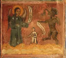 ![]() Свобода волі як християнський сюжет. Розпис 1717 року в одній з болгарських церков. |