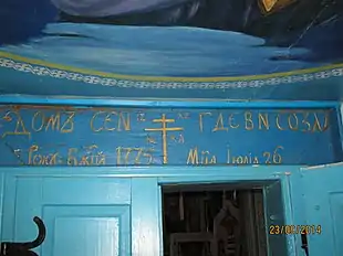 На перетинці над вхідними дверима до бабинця зберігся старовинний різьблений напис з датою будівництва церкви: «ДомЪ сеи гдє вN созда Року Божій 1775 М-ца Іюліа 26».