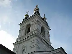 Дзвіниця цегляна, тинькована, триярусна (архітектор Сємєчкін). Нижній ярус прямокутний в проєкції, наступні квадратні завершені шатром, увінчаним банею. Аналогічні бані встановлені по кутах шатра. Декор фасадів стильово походить із російської архітектури 17 століття. Дзвіниця з'єднується з притвором коротким переходом з перекриттям по балках.[2]