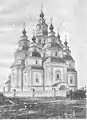 Споруджувалася церква у 1902—1906 рр. Трудами архиєпископа Парфенія (Левицького) було висловлене побажання архітектору-художнику І. С. Кузнецову — храм мав бути мурованим і схожим на відомий дерев'яний Троїцький собор у місті Новомосковську (тепер Дніпропетровської області).[1] Архітектор зміг не лише запроектувати в камені точну копію знаменитої козацької церкви, щоправда у зменшеному розмірі — 2/3 від об'єму оригіналу, але й удосконалив силует майбутнього храму. По завершенні будівництва перед громадою постала монументальна дев'ятибанна споруда, що підіймалася на горі над р. Псел і яку було видно за багато кілометрів.