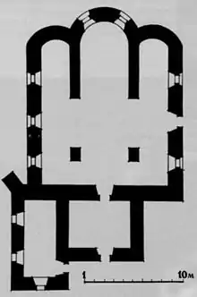 Спасопреображенська церква Спаського монастиря, яка, судячи із вцілілого схематичного плану та короткого візитацінного опису XVIII ст., продовжувала традицію вертикально розвинутих храмів з перелому XII—XIII ст.[5]