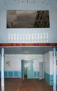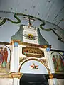 Над іконостасом, на стіні, зображено двох ангелів, які тримають зелену стрічку, на якій українською мовою білим кольором пише: