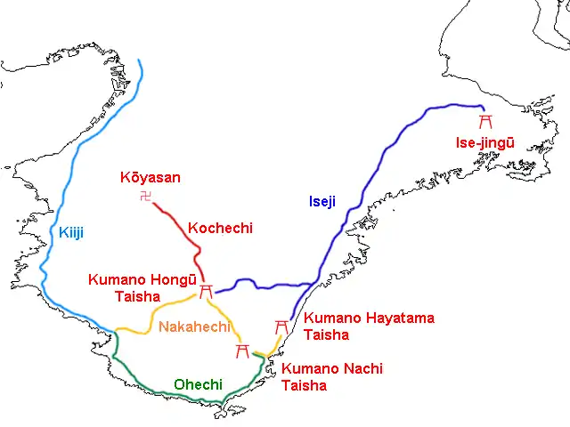 - Велика стежка, яп. 大辺路, «Оохети»: Танабе — Кусімото (串本) — Три Священні Гори Кумано, 120 км уздовж узбережжя океану