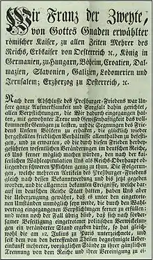 6 серпня 1806 року Франц II оголосив про складання з себе титулу і повноважень імператора Священної Римської імперії, пояснивши це неможливістю виконання обов'язків імператора після укладення Рейнського союзу. Одночасно він звільнив імперські князівства, класи, чини і посадових осіб імперських установ від обов'язків, накладених на них імперською конституцією. Хоча акт про зречення і не був бездоганний з юридичної точки зору (досі ведуться дебати з питання, чи мав імператор право одноосібно приймати рішення про скасування імперії), в Німеччині вже не було політичної волі підтримувати існування імперської організації. Священна Римська імперія перестала існувати.