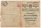 Посвідка про народження УРСР, зразка 1943 року. Обкладинка
