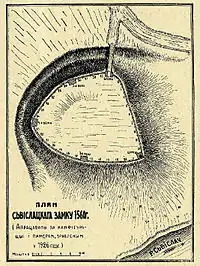 У середині XVII століття замок мав форму прямокутника (72,8×63,5 м), був відокремлений від решти плато широким (близько 15 м) арочним ровом та укріплений земляним валом. Замчище підняте на 12 м над рівнем води у Свіслочі. У першій половині XIII століття замок був спалений. Потім його і місто зруйнували у 1506 році кримські татари та в 1535 році російські війська. Вже 1501 року у замку Свіслоч була вогнепальна зброя, в тому числі гармати. За планом Свіслоцького замку (1647), складеного власником Свіслоча князем Богуславом Радзівілом, у дерев'яному замку було 3 вежі, у т.ч. в'їзна брама та 2 секції стін довжиною 39 та 35,8 метри відповідно. На самому мисі Свіслацького замку є прямокутна будівля (ймовірно, будинок адміністратора). У другому плані Радзівіла, крім замку, є відрізок території між Березиною та Свіслоччю. На місці їх найближчої течії поруч знаходився земляний вал із воротами на ньому та оборонний рів, який був наповнений річковими водами. Другий знаходився збоку мосту через річку Свіслоч.
