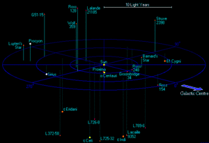 Найближча до Сонця зоря, Проксима Центавра, перебуває на відстані близько 4,3 світлового року. Діаметр нашої Галактики — близько 100 000 світлових років. Відстань між галактиками — близько десятків мільйонів світлових років. Розміри Видимого Всесвіту — близько 13,7±0,12 млрд світлових років[7].