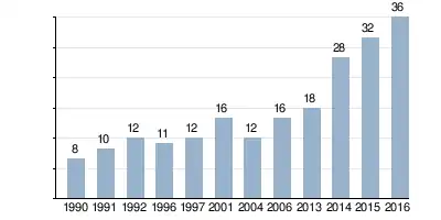 | 18 (1990—1992, 1999—2016) | 6 (2001, 2002, 2006, 2007, 2015, 2016) | ||