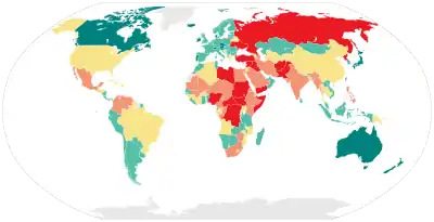 | Країна | 2016 (позиція) | 2016 (рейтинг)[1] | 2015 (позиція) | 2015 (рейтинг)[2] | 2014 (позиція) | 2014 (рейтинг)[3] | 2013 (позиція) | 2013 (рейтинг)[4] | 2012 (позиція) | 2012 (рейтинг)[5][6] | 2011 (позиція) | 2011 (рейтинг)[6][7] | 2010 (позиція) | 2010 (рейтинг)[8] | 2009 (позиція) | 2009 (рейтинг) | 2008 (позиція) | 2008 (рейтинг) |