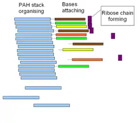 Зміна умов на ранній Землі пізніше призвела до від'єднання від ПАВ РНК-подібних молекул. У результаті вулканічної активності відбулося короткочасне збільшення кислотності навколишнього середовища (вивільнення кислотних газів, оксиду сірки, вуглекислого газу), що, можливо стало причиною від'єднання азотистих основ від остову ПАВ, що призвело до формування РНК-подібної молекули. Але замість цукрофосфатного остову, у цих молекул був формальдегідний остов, але з таким же кроком у 0,34 нм.