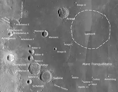 Близько 85 км на схід-південний схід є "Море Спокою" (посадка Аполлон-11).