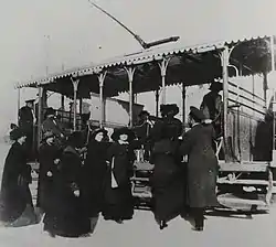 | Пасажирів настільки багато, що місця займають ледь не з боєм. Адміністрація трамваю була вимушена причепити запасні вагони, проте й це не задовольняє потребу в пересуванні, особливо у святкові дні. Населення міста не натішиться комфортом і дешевизною подорожі в трамвайних вагонах, що дає можливість, окрім поїздок у справах, звершувати приємні прогулянки Оригінальний текст (рос.) Количество пассажиров настолько велико, что места берутся чуть ли не с бою. Администрация трамвая вынуждена была распорядиться о прицепке запасных вагонов к главным, но и эта мера не удовлетворяет нужду в передвижении, особенно в праздничные дни. Население города не нахвалится удобствами и дешевизною путешествия в вагонах трамвая, что дает возможность, помимо деловых поездок, совершать приятные прогулки |