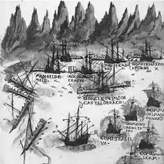 Із сприятливим вітром Сейді Алі-реїс залишив порт Гвадар і знову відплив в напрямку Ємену. Флотилія знаходилась в морі кілька днів і майже досягнула Зофара і Шара, коли раптом із заходу піднялася велика буря, відома серед арабів, як Філ Туфані (Тайфун слона). Османський флот був відкинутий назад і не зміг встановити вітрила, навіть трінкетлу (штормові вітрила). Ніч і день були схожі, і через пошкодження кораблів весь баласт довелося викинути за борт.