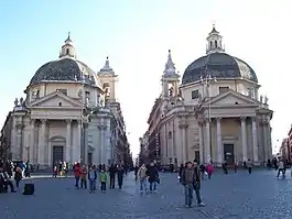 Важливу містобудівну функцію мала п'яцца дель Пополо, куди поперше прибували паломники-католики з північних країн (папський Рим століттями жив і підживлював власну економіку за рахунок грошей паломників). Доменіко Фонтана надав нового ансамблевого характеру площі дель Пополо, приховавши хаотичну забудову напівциркульними мурами. Використавши трапецію історичної площі, вніс в неї три осі, початок трипроменевого розпланування головних вулиць, що логічно пов'язало площу з головними церквами для відвідин паломників. Акцентами, парадними пілонами площі стануть дві майже однакові церкви на розі трьох вулиць — Санта Марія ін Монте Санто та Санта Марія деї Міраколі, вибудовані архітектором Карло Райнальді(1611—1691) набагато пізніше (після 1661 року)[6]. Ефектна площа з майже театральною композицією, вузлом трьох осей і дальніми перспективами в глиб міста справила могутнє враження на сучасників і нащадків. І матиме значний вплив на містобудівну ситуацію в різних містах і садах бароко різних країн[6] (розпланування міста Версаль, розпланування Санкт-Петербурга, розпланування Нижнього парку в Петергофі тощо).