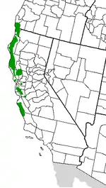 Поширена в північноамериканських лісах вздовж берега Тихого океану. Росте в Каліфорнії
