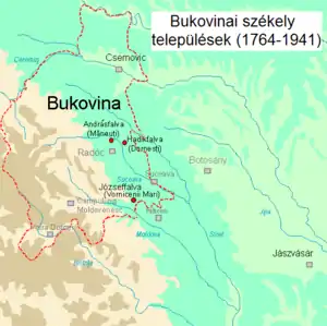 До 1941 секеї населяли деякі села сучасного румунського повіту Сучава, зокрема: Гадікфалва (Hadikfalva, нині Дорнешть), Андрашфалва (Andrasfalva, нині Менеуць), Йожеффалва (Józseffalva, нині Ворніченій-Марь) [1].