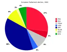 У наступному прикладі діаграма базується на попередніх результатах виборів до Європейського парламенту в 2004 році. В таблиці вказано кількість місць, виділених для кожної партії, а також відсоток. який вони складають із цілого числа. Значення в останньому стовпці дорівнює значенню центрального кута кожного сегмента, визначається шляхом множення відсоток на 360 °.