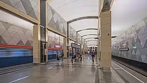 Станційні приміщення утворюють анфіладу залів, висота стелі в середній частині станції досягає 12 м.[4]. В оздоблені основної частини колійних стін станції використовуються композитні панелі у вигляді різнокольорових трикутників, цоколь колійних стін оздоблено чорним габро. Платформа оздоблена трьома видами каменю — сибірським, камнегорським гранітами і габро. На 38 колонах станції[4] розташовано 66 світильників, по одному на кожну з двох протилежних сторін кожної колони, звернених до центрального і бічних залів[5]. Нижня половина колон оздоблена травертином[6] зі вставками вертикальних молдингів з нержавіючої сталі, верхня — композитними панелями того ж кольору, що і травертин[4]. Наземні павільйони станції планується оформити у стилі ар-нуво, як у Паризькому метрополітені[7]