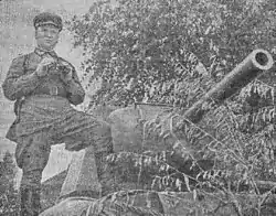 ![]() Командир 5-го танкового корпусу Герой Радянського Союзу генерал-майор Семенченко на борту танка КВ-1. Фото з фронтової газети. 1942 рік. | |