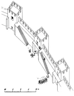 Вже на початку V ст. до н. е. місто обноситься кам'яною фортечною стіною з прямокутними вежами, розташованими на відстані 15-18 м одна від одної. Вежі виступали більш ніж на 3 м за лінію стіни, що було важливо для ураження супротивника під час облоги міста не тільки в лоб, але й з флангів. Товщина стін дорівнювала 2,5 м, але так як з внутрішньої сторони стіни пристроювалися кам'яні сходи, то ширина фортечних стін зростала до чотирьох метрів. У висоту стіна сягала в давнину 6 м. Оборонні споруди міста двічі піддавалися руйнації у зв'язку з військовими діями. Свідченням цьому служать потужні шари попелу, які є наслідком великих згарищ і руйнувань. Найбільш фортечні стіни постраждали в кінці V або на початку IV ст. до н. е. Існує припущення, що це було пов'язано з тими війнами між синдами та окремими меотськими племенами, відгомони яких знаходяться в новелі «Військові хитрощі» Поліена про меотянку Тіргатао. Але незабаром стіни були відновлені й проіснували до кінця століття. В кінці IV ст. до н. е. вони були майже повністю зруйновані й більше не відновлювалися. Саме тоді йшла міжусобна війна між синами боспорського царя Перісада I, який помер в 309 р. до н. е. Театром воєнних дій було лівобережжя річки Кубань в її пониззі. Не виключено, що вторинне руйнування фортечних стін Семибратнього городища стало результатом військових дій між синами Перісада. На початку III ст. до н. е. збудовано нова фортечну стіна, яка за своєю міццю поступалася колишній[6].