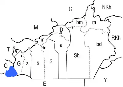 | Сусідні райони: E: Ісфахан, G: Голестан, M: Мазендеран, NKh: Північний Хорасан, Q: Кум, RKh: Хорасан-Резаві, T: Тегеран, Y: Йєзд | ||||