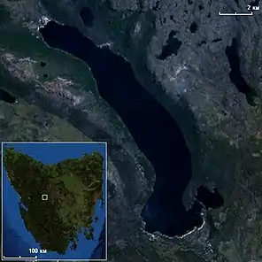 ![]() Світлина озера з низької орбіти, на врізці о. Тасманія | ||||