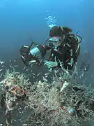 Juvenile Black або Сіра риба-ангел або Сіра Скалярія, на задньому фоні затонулий фургон