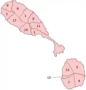 Сент-Кіттс і Невіс ділиться на 14 округів. Дев'ять з них розташовані на острові Сент-Кіттс і п'ять на острові Невіс: