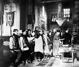 Цілу низку світлин присвячено весільному обряду. Більшість з них зроблена фотографом на Верховинщині. Серед фотографій є урочисті портрети молодят, а також різноманітні сцени традиційного гуцульського весілля як-то весільний похід на конях, вінчання в церкві, весільне ворожіння, танці, тощо. Фотографії молодих пар вражають багатством традиційного гуцульського весільного вбрання. «Княгині» вбрані в чільця, ошатний гуцульський стрій завершує біла весільна ґуґля. У строї «князя» ґуґлю іноді замінює весільна манта. Решта світлин розповідає про гуцульські весільні обряди, які подекуди вже втрачені.