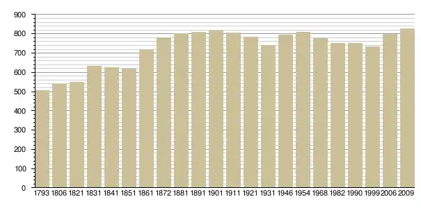 Динаміка населення (base Cassini de l'EHESS pour les nombres retenus jusque 1962[3], base Insee à partir de 1968 (population sans doubles comptes puis population municipale à partir de 2006)[4] · [5] ):