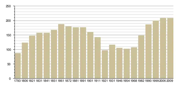 Динаміка населення (base Cassini de l'EHESS pour les nombres retenus jusque 1962[3], base Insee à partir de 1968 (population sans doubles comptes puis population municipale à partir de 2006)[4] · [5] ):