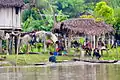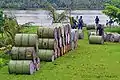Pagwi is the most important access point to the Middle Sepik. Men unload barrels of fuel for motor-canoes (2010)