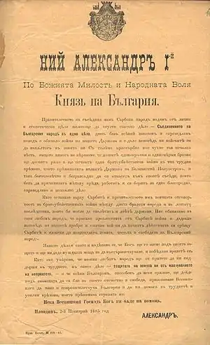 6 вересня 1885 Князівство Болгарія і напівавтономна провінція Османської імперії Східна Румелія заявили про своє об'єднання в місті Пловдив. Східна Румелія, населення якої складали переважно етнічні болгари, була штучно створена Берлінським конгресом сім років тому. Об'єднання відбулося всупереч волі великих держав, включаючи Російську імперію. Австро-Угорська імперія в той час розширювала свій вплив на Балканах і була особливо незадоволена. Королівство Сербія також побоювалась цього, оскільки це могло погіршити позиці Сербії на Балканах. Крім того, правитель Королівства Сербія Мілан Обренович IV був невдоволений, тим що сербські лідери опозиції, такі як Нікола Пашич, який уникнув переслідувань після Повстання Тімок, знайшли притулок у Князівстві Болгарія.