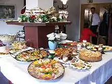- Французьке сервування — страви виставляються на стіл, гості самі вибирають їх;